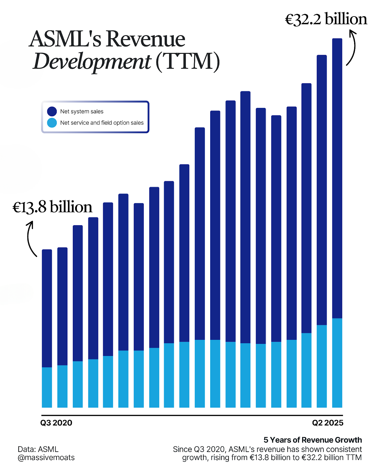 For Q2 2025, ASML reported revenue of €7.7 billion, including the sale of one High-NA tool. Over the past four quarters, ASML's trailing twelve-month (TTM) revenue reached €32.2 billion, marking a 26% increase YoY. The revenue trend over the past five years (quarterly, TTM) is illustrated in the graph below.