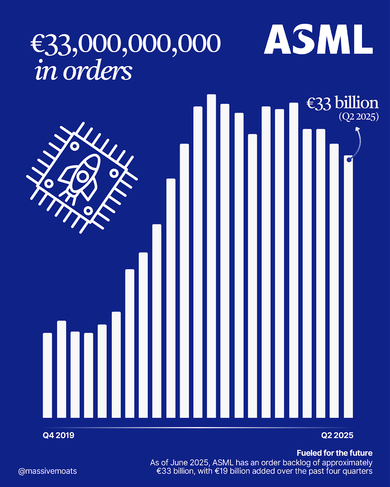 In Q2 2025, ASML secured total net bookings of €5.5 billion, which included €2.3 billion in EUV orders. The company's order backlog currently stands at approximately €33 billion. This figure accounts for a €1.4 billion write-off related to the cancellation of orders from China, as Chinese customers were, in this quarter, required to make a choice regarding their existing orders following the 2024 export controls.